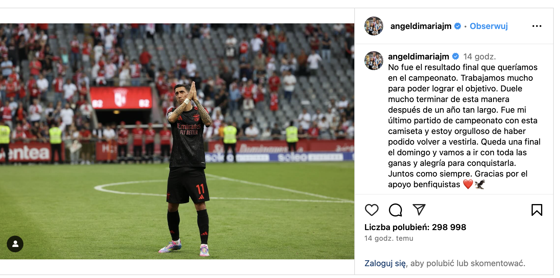 Trudno zakończyć w ten sposób po tak długim sezonie. To był mój ostatni mecz ligowy w tej koszulce i cieszę się, że mogłem ją ponownie nosić. W niedzielę czeka nas jeszcze finał i zamierzamy przystąpić do niego z pełnym zaangażowaniem i radością, aby zdobyć zwycięstwo. Razem, jak zawsze. Dziękuję za wsparcie, kibice Benfiki.